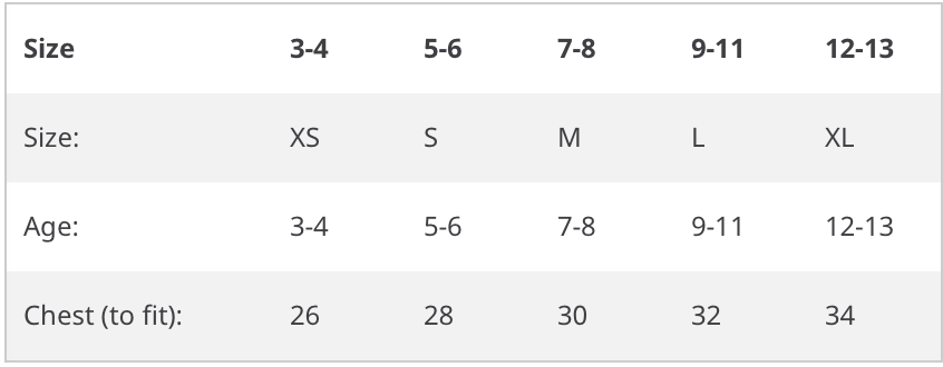 | Size | age 3-4, age 5-6, age 7-8, age 9-11, age 12-13, Small, Medium, Large, x large |